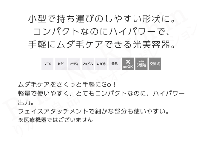※医療機器ではございません ■コンパクトなのにハイパワー 軽量約270gで使いやすく、とてもコンパクトなレイボーテ Go VIタイプ。